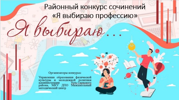 В рамках профориентационной работы в Усть-Таркском районе с апреля по май проводился районный конкурс сочинений «Я выбираю профессию» для учащихся 8-11 классов. В этом году в конкурсе участвовали более 200 учащихся из 15 общеобразовательных организаций нашего района. Школьники рассказали о той профессии, в которой они хотели бы видеть себя в будущем. На конкурсе были представлены сочинения–рассуждения о более тридцати различных профессиях.